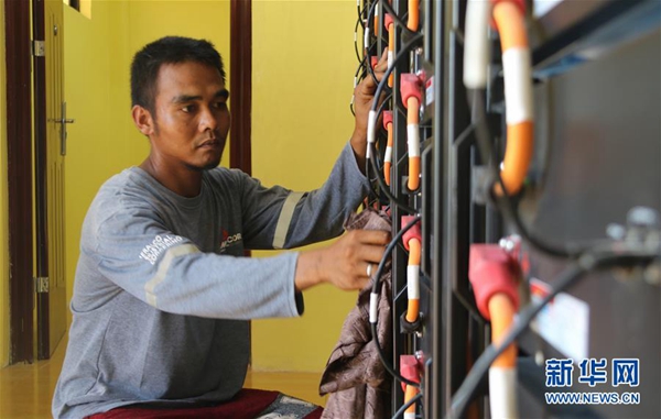 6月6日,在菲律賓北部偏遠山區(qū)的巴利瓦特村,村民迪奧內斯托·埃斯特萬在太陽能發(fā)電站進行電力設備日常檢查和維護。新華社記者 鄭昕 攝