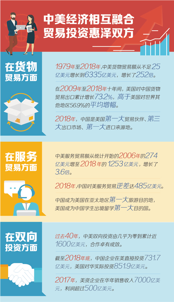 在國際經(jīng)濟合作中,正常的貿(mào)易關(guān)系是建立在等價交換基礎(chǔ)上的互惠互利關(guān)系,而不是你多我少、你輸我贏的“零和博弈”。國際貿(mào)易有利于推動資源在世界范圍內(nèi)優(yōu)化配置,促進各國經(jīng)濟共同發(fā)展,推動人類社會共同進步,國際貿(mào)易的歷史早已證明這樣的實踐是有效的,實踐經(jīng)驗也早已成為國際經(jīng)濟學(xué)的基本原理,中美經(jīng)貿(mào)合作的事實也作了同樣的驗證。中美建交以來,在雙邊貿(mào)易方面,1979年至2018年,雙邊貨物貿(mào)易額從不足25億美元增長到6335億美元,增長了252倍;在雙向投資領(lǐng)域,過去40年,中美雙向投資由幾乎為零到累計近1600億美元,中美互為對方重要投資伙伴,投資的雙向性和互惠性進一步顯現(xiàn)。中美經(jīng)貿(mào)關(guān)系發(fā)展的歷程證明,中美通過優(yōu)勢互補、互通有無,有力促進了各自經(jīng)濟發(fā)展和產(chǎn)業(yè)結(jié)構(gòu)優(yōu)化升級,雙方經(jīng)貿(mào)往來是惠澤彼此的關(guān)系,而非中國讓美國“吃虧”的過程。