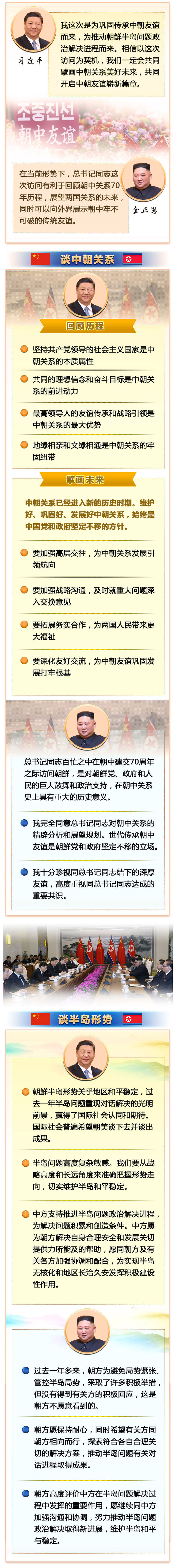 習(xí)近平指出,去年以來,我和委員長(zhǎng)同志4次會(huì)晤,書寫了中朝關(guān)系新篇章,并結(jié)下了深厚友誼。感謝金正恩委員長(zhǎng)同志為我這次訪問舉行的隆重而熱烈的歡迎儀式,我今天從下飛機(jī)到抵達(dá)住處,所到之處無不感受到中朝一家親的濃厚氛圍。今年是中朝建交70周年,在兩黨兩國關(guān)系發(fā)展史上具有承前啟后、繼往開來的重要意義,我又同金正恩委員長(zhǎng)在平壤會(huì)面。我這次是為鞏固傳承中朝友誼而來,為推動(dòng)朝鮮半島問題政治解決進(jìn)程而來。相信以這次訪問為契機(jī),我們一定會(huì)共同擘畫中朝關(guān)系美好未來,共同開啟中朝友誼嶄新篇章。