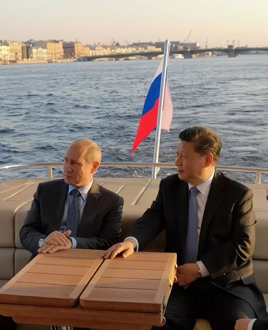 ↑6月6日,習(xí)主席在圣彼得堡同普京總統(tǒng)再次舉行會晤。普京總統(tǒng)邀請習(xí)主席共同乘船游覽涅瓦河。普京總統(tǒng)歡迎習(xí)主席再次到訪他的家鄉(xiāng),并向習(xí)主席介紹圣彼得堡的風(fēng)土人情和沿途建筑。新華社發(fā)