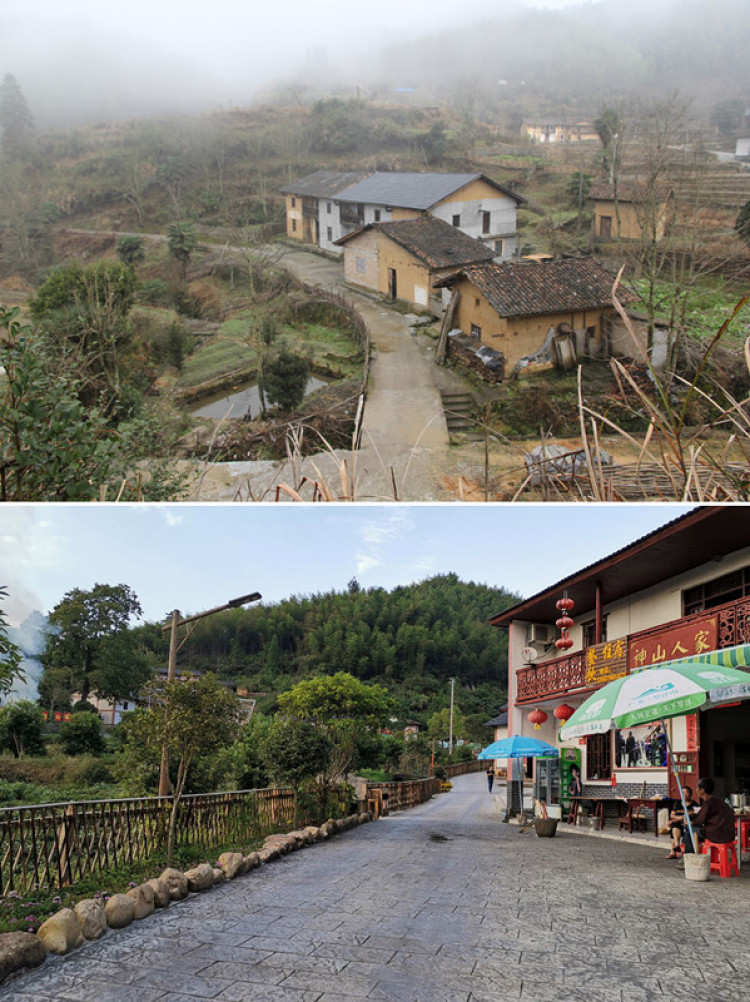 上圖:脫貧前的井岡山市神山村一角。攝于2016年1月;下圖:現(xiàn)在的井岡山市神山村一角。攝于2019年9月。(新華社發(fā))