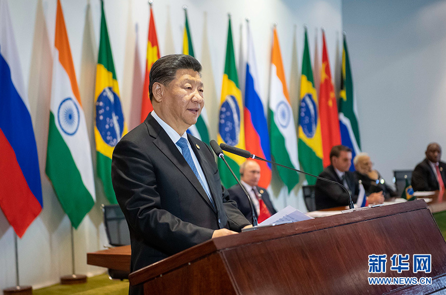 當(dāng)?shù)貢r間11月14日,金磚國家領(lǐng)導(dǎo)人同金磚國家工商理事會和新開發(fā)銀行對話會在巴西利亞舉行。中國國家主席習(xí)近平、巴西總統(tǒng)博索納羅、俄羅斯總統(tǒng)普京、印度總理莫迪、南非總統(tǒng)拉馬福薩共同出席。這是習(xí)近平發(fā)表講話。 新華社記者 王曄 攝