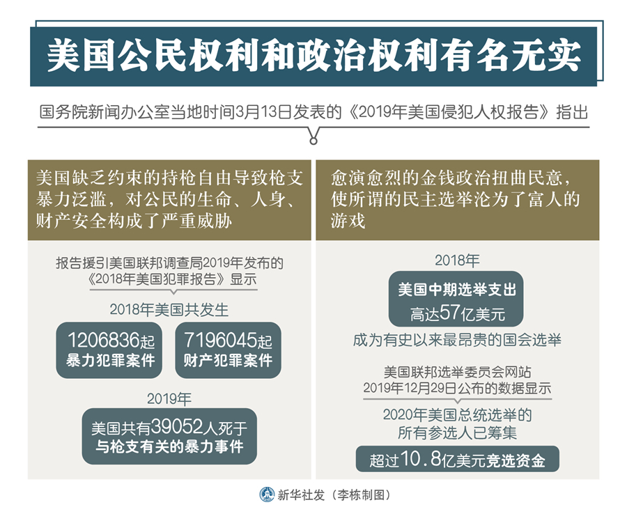 新華社北京3月13日電(記者王子銘、賈釗)國務院新聞辦公室13日發(fā)表的《2019年美國侵犯人權報告》指出,美國缺乏約束的持槍自由導致槍支暴力泛濫,對公民的生命、人身、財產安全構成了嚴重威脅;愈演愈烈的金錢政治扭曲民意,使所謂的民主選舉淪為了富人的游戲。