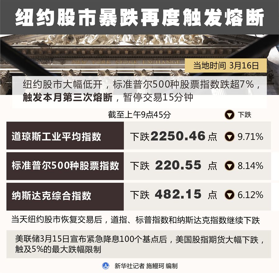 由于新冠肺炎疫情在美國(guó)持續(xù)擴(kuò)散引發(fā)市場(chǎng)廣泛擔(dān)憂,紐約股市16日開(kāi)盤(pán)暴跌,并再次觸發(fā)7%的熔斷點(diǎn)。交易重啟后跌幅擴(kuò)大,收盤(pán)時(shí)紐約股市三大股指均暴跌超過(guò)11%。