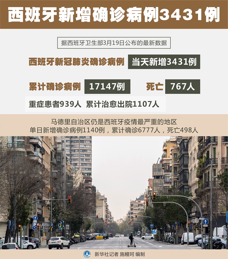 新華社馬德里3月19日電(謝宇智)據(jù)西班牙衛(wèi)生部19日公布的最新數(shù)據(jù),該國(guó)當(dāng)天新增3431例新冠肺炎確診病例,累計(jì)確診病例為17147例,死亡767人,重癥患者939人,累計(jì)治愈出院1107人。