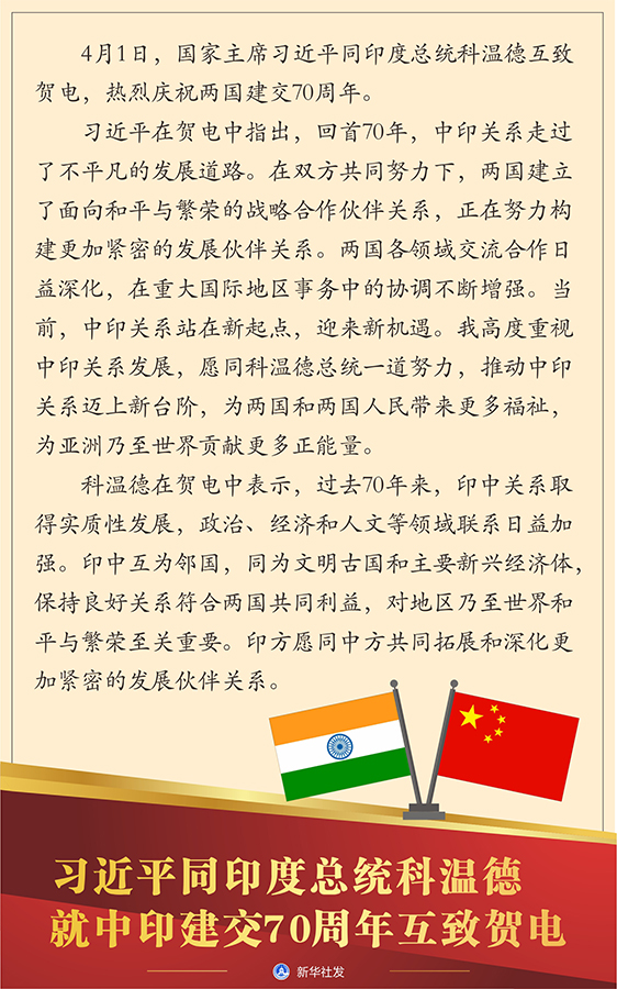 新華社北京4月1日電 4月1日,國(guó)家主席習(xí)近平同印度總統(tǒng)科溫德互致賀電,熱烈慶祝兩國(guó)建交70周年。