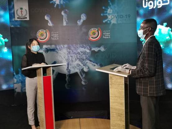 4月2日,中國第35批援蘇丹醫(yī)療隊(duì)隊(duì)員鄭喜在蘇丹國家新冠肺炎防控中心演播廳接受采訪并錄制視頻。(圖片由醫(yī)療隊(duì)提供)