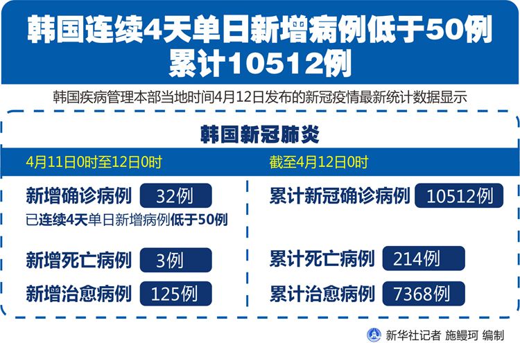 新華社首爾4月12日電(記者陸睿)韓國疾病管理本部12日發(fā)布的新冠疫情最新統(tǒng)計數(shù)據(jù)顯示,當(dāng)?shù)貢r間11日0時至12日0時,韓國新增32例確診病例,已連續(xù)4天單日新增病例低于50例。