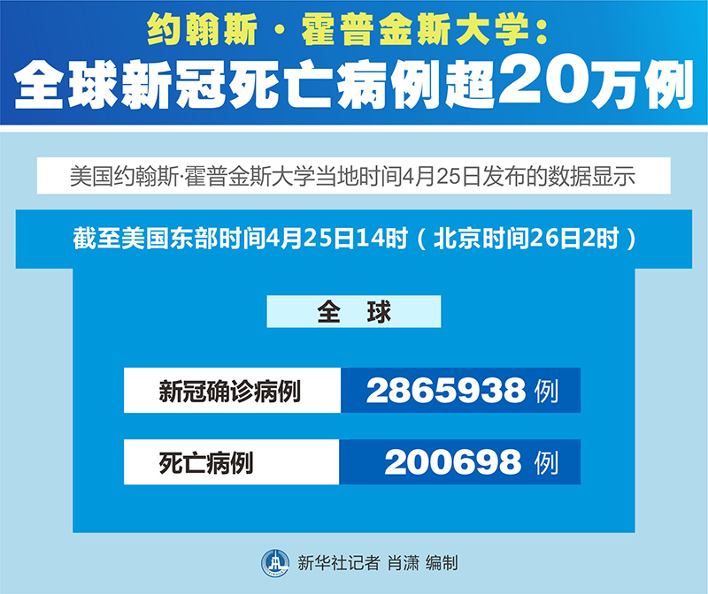 新華社紐約4月25日電? 美國(guó)約翰斯·霍普金斯大學(xué)25日發(fā)布的新冠疫情最新統(tǒng)計(jì)數(shù)據(jù)顯示,全球新冠死亡病例超過(guò)20萬(wàn)例。