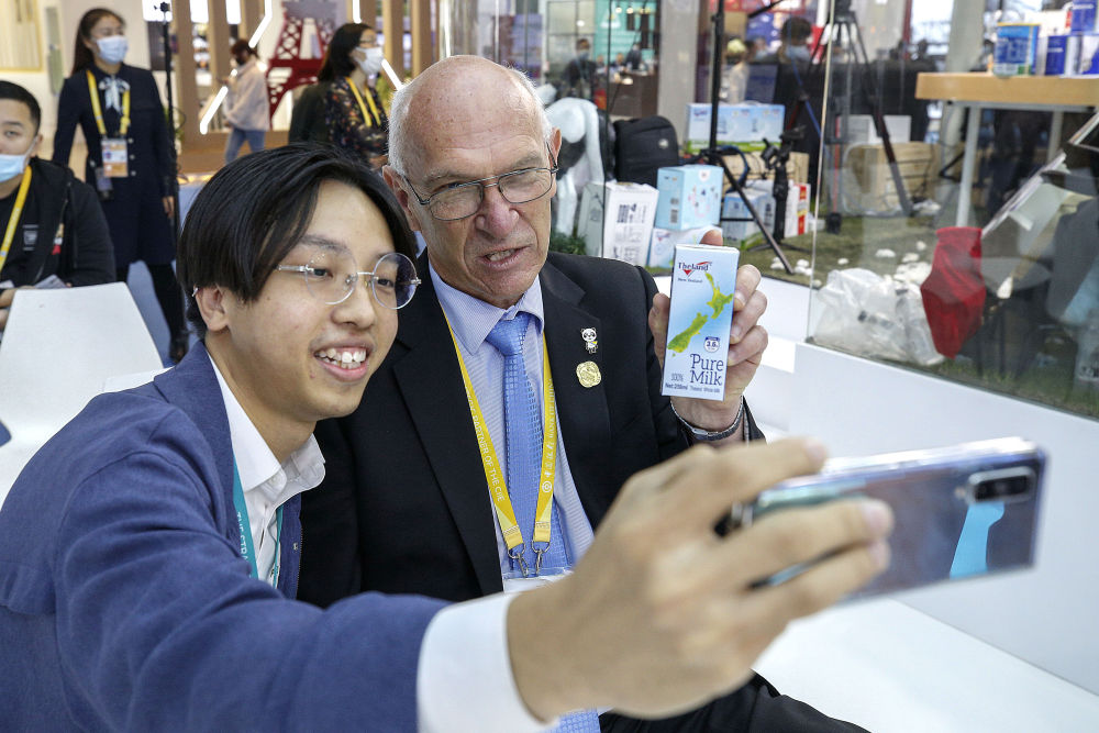 11月7日,羅伊(右)在第三屆進(jìn)博會紐仕蘭乳業(yè)展臺和粉絲合影。