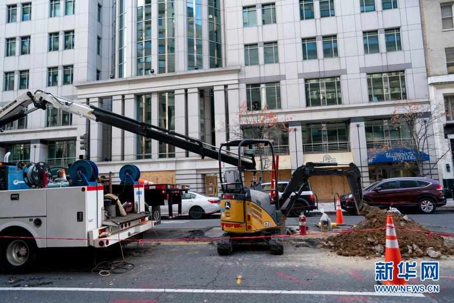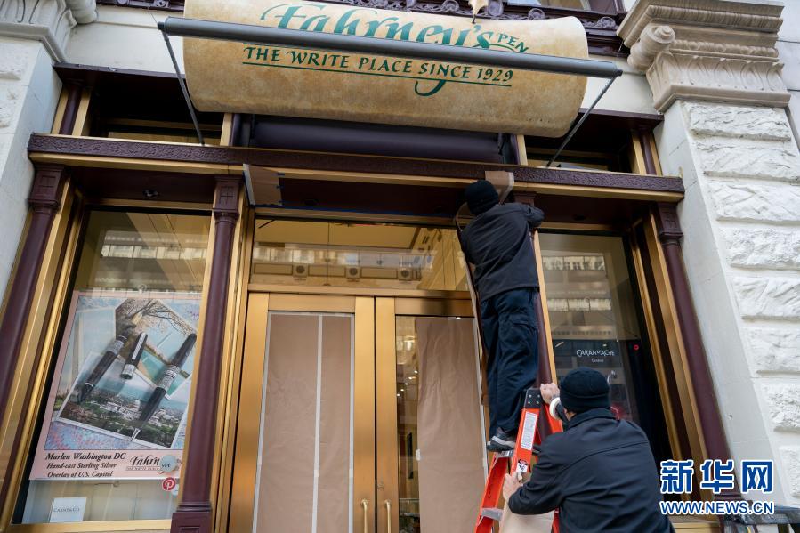 11月19日,在美國華盛頓,工作人員在裝修一家文具店的門臉。新華社記者 劉杰 攝