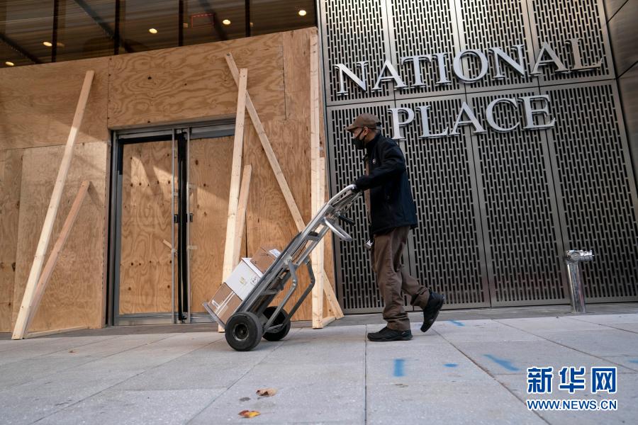 11月19日,美國華盛頓的一名快遞員經(jīng)過一處用木板加固門窗的辦公樓。新華社記者 劉杰 攝