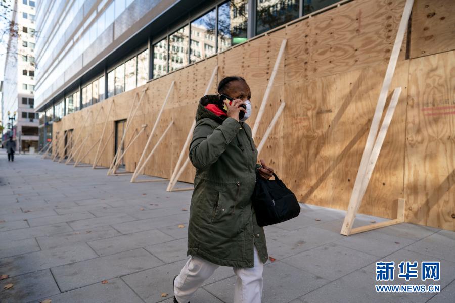 11月19日,在美國華盛頓,一名打電話的行人經(jīng)過用木板加固門窗的辦公樓。新華社記者 劉杰 攝