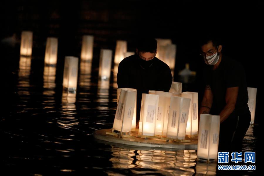 11月30日,在巴西首都巴西利亞,兩名男子往湖中放入水燈。新華社發(fā)(盧西奧·塔沃拉攝)