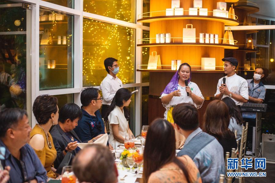11月23日,廚娘卡妮塔(后排右三)在泰國曼谷天堂酒店向客人介紹她烹制的葡式、泰式和中式風(fēng)味的融合菜。新華社記者 陳家寶 攝