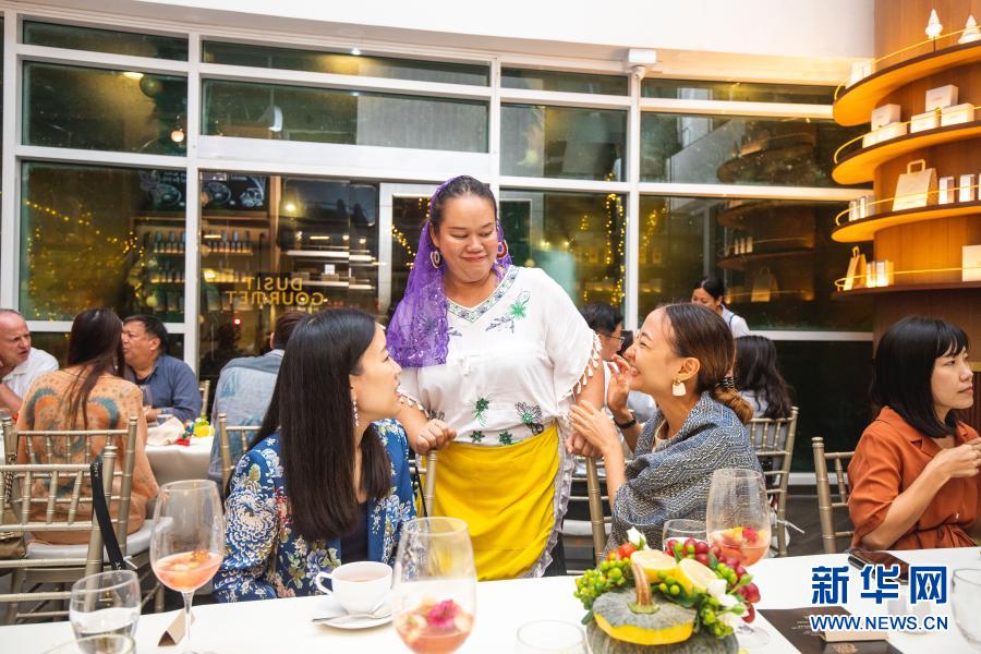 11月23日,廚娘卡妮塔(中)在泰國曼谷天堂酒店向客人介紹她烹制的葡式、泰式和中式風(fēng)味的融合菜。新華社記者 陳家寶 攝