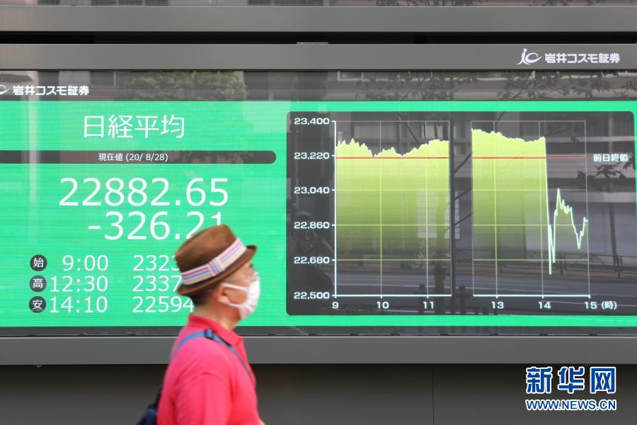 8月28日,日本東京街頭的一處電子股指顯示屏顯示,下午14時左右,受時任日本首相安倍晉三或因健康原因辭職影響,股市指數(shù)急速下跌。新華社記者 杜瀟逸 攝