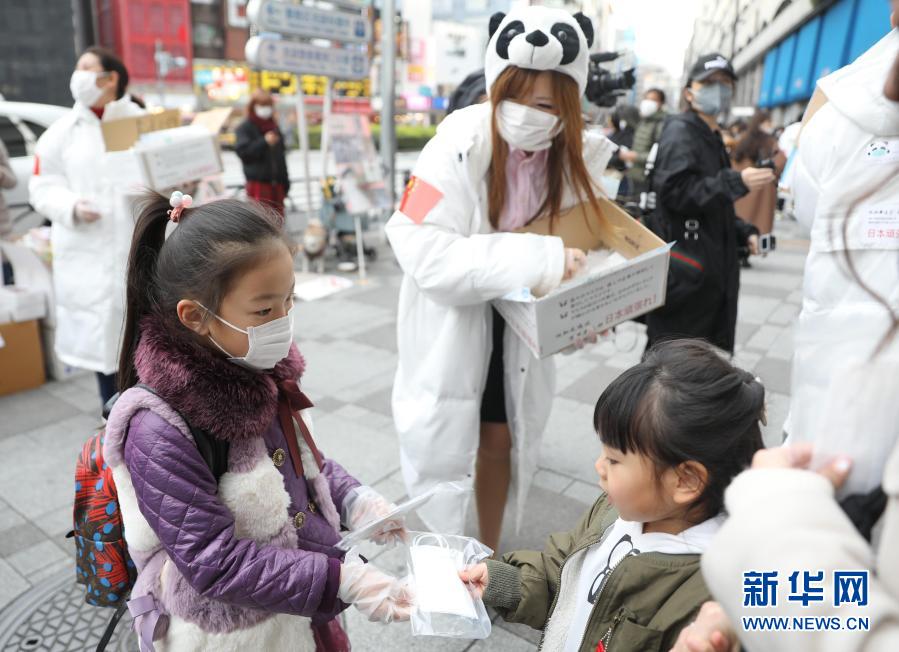 2月29日,在日本東京的池袋站前,在日華僑華人志愿者團體“口罩熊貓行動小組”向當(dāng)?shù)孛癖娒赓M發(fā)放口罩,一名小志愿者(左)將兒童用口罩送給日本小朋友。新華社記者 杜瀟逸 攝