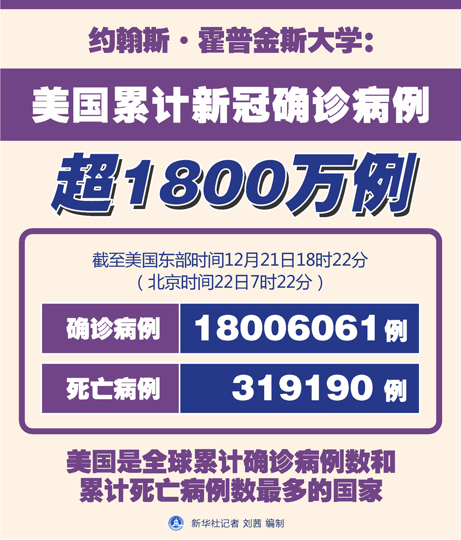 新華社紐約12月21日電 美國約翰斯·霍普金斯大學21日發(fā)布的新冠疫情最新統(tǒng)計數(shù)據(jù)顯示,美國累計確診病例超過1800萬例。