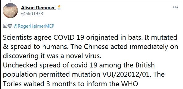 他在12月28日的一條推特中請(qǐng)求外界不要再將變異新冠病毒稱為“起源于英國(guó)”,而只是“在英國(guó)發(fā)現(xiàn)”。但這條推特徹底“翻車”,大量網(wǎng)民在評(píng)論中挖出赫爾默曾將新冠病毒污蔑為“中國(guó)病毒”的評(píng)論,指責(zé)他演繹“非常標(biāo)準(zhǔn)的雙重標(biāo)準(zhǔn)”。