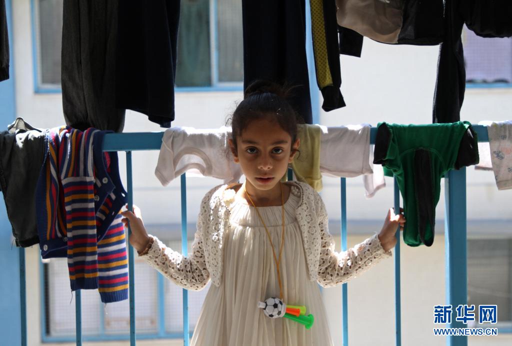 5月19日,受空襲影響而逃離家園的7歲巴勒斯坦兒童達(dá)娜·法拉杰在加沙城的一所學(xué)校臨時(shí)棲身。
