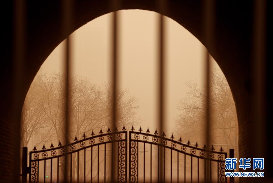 這是3月15日拍攝的沙塵中的寧夏銀川鼓樓拱門。當日,我國北方多地出現沙塵天氣。新華社記者 楊植森 攝