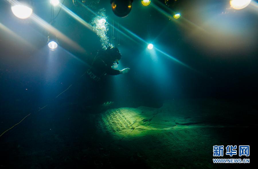 3月15日,在長江水下40多米的白鶴梁題刻無壓容器罩內,潛水員在進行清理作業(yè)。新華社記者 劉潺 攝