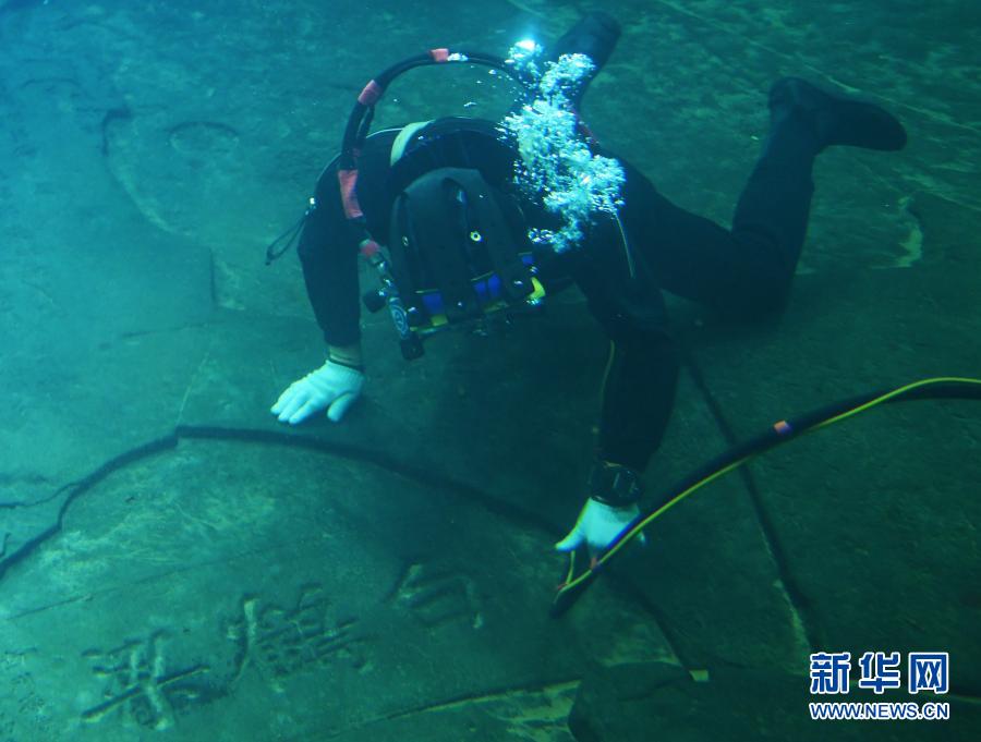3月15日,在長江水下40多米的白鶴梁題刻無壓容器罩內(nèi),潛水員在對題刻上的泥沙進行清理。新華社記者 王全超 攝