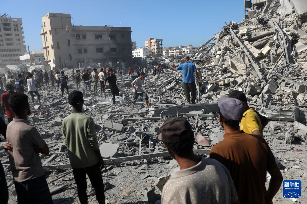 9月8日,人们在加沙城查看一座高层建筑遭以色列军队空袭后的废墟。新华社发(里泽克·阿卜杜勒贾瓦德摄)