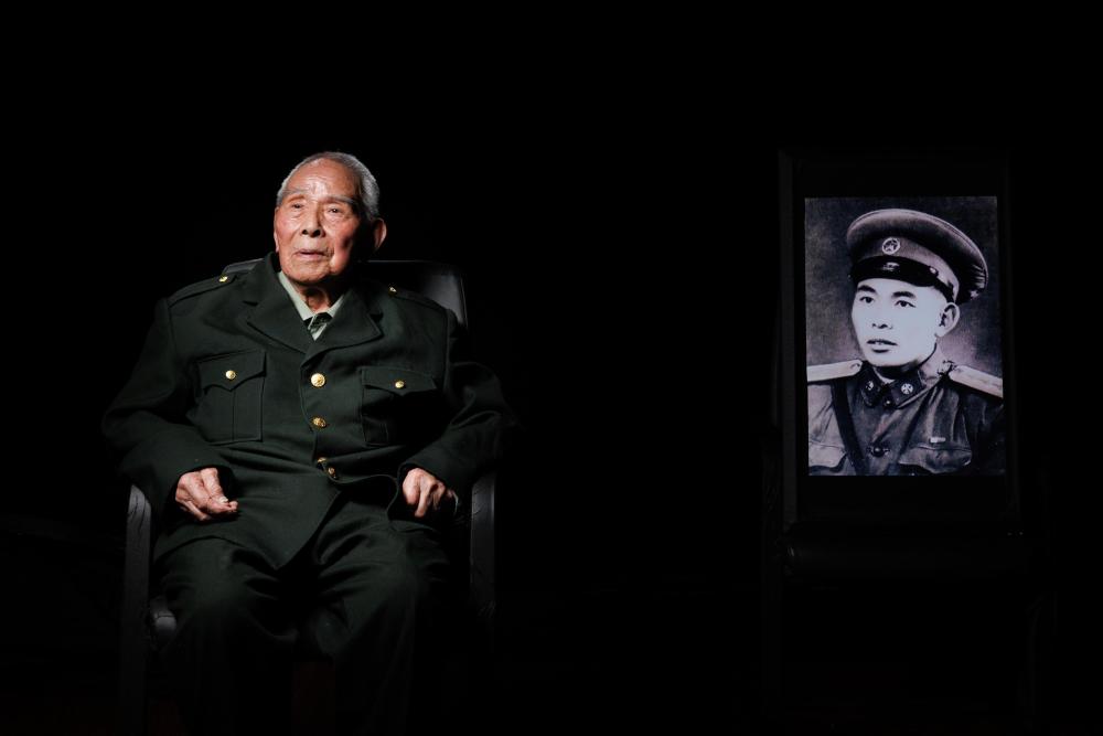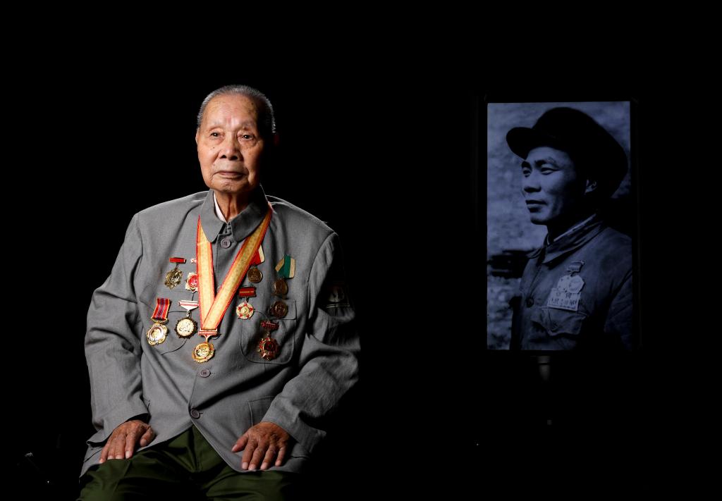 这是96岁的抗战老战士宋金堦与自己年轻时的戎装照合影(9月25日摄)。