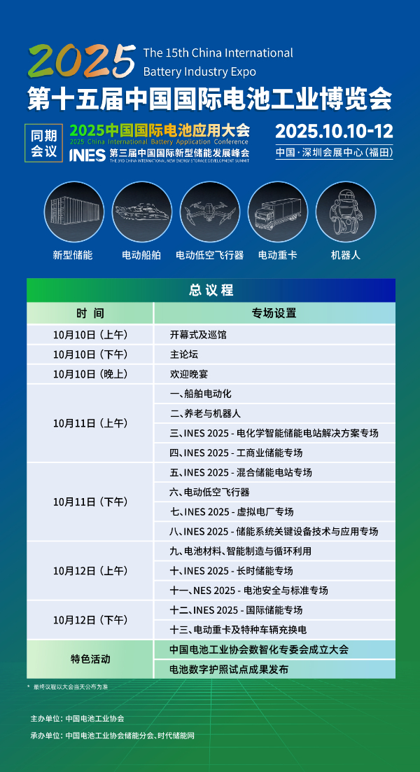 2025年10月10-12日,以“动能无界、芯赋未来”为主题的2025中国国际电池应用大会暨第三届中国国际新型储能发展峰会(INES2025)将在深圳福田会展中心举行。
