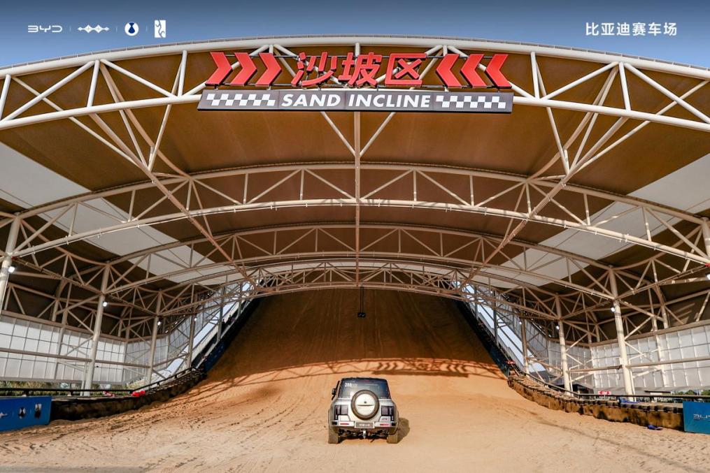 不同于传统赛车场的单一赛道设计,比亚迪将全国特色地形 “搬进” 赛车场,打造浮水航行、沙漠冲坡等特色地形,让用户无需长途跋涉,就能一站式打卡极致场景。其中,悬天沙坡区以29.6米垂直高度和28°冲坡落差斩获“最高、最大的冲沙测试场”两项吉尼斯纪录,让消费者可在城市即可体验阿拉善的冲沙乐趣,顶部配备的300平米观景平台可以避开极寒极热,舒适赏冲坡享极限乐趣。