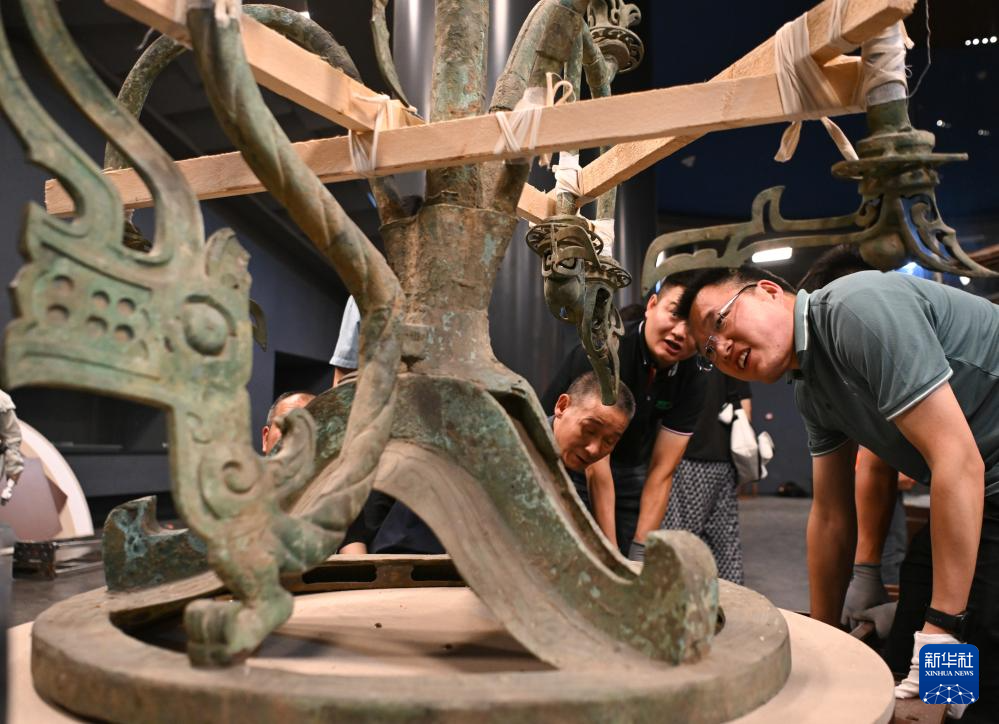 经过一个多月时间的闭馆后,7月27日,三星堆博物馆新馆在四川德阳广汉市试运行,一大批珍贵文物再次与公众见面。其中,高3.96米、重360斤的Ⅰ号大型铜神树是三星堆的“镇馆之宝”,也是新馆的“压轴之作”。在充分讨论搬迁方案后,工作人员用两天时间成功完成了它的保护性固定、分离、转运、入库等环节,并在新馆试运行后正式展出。