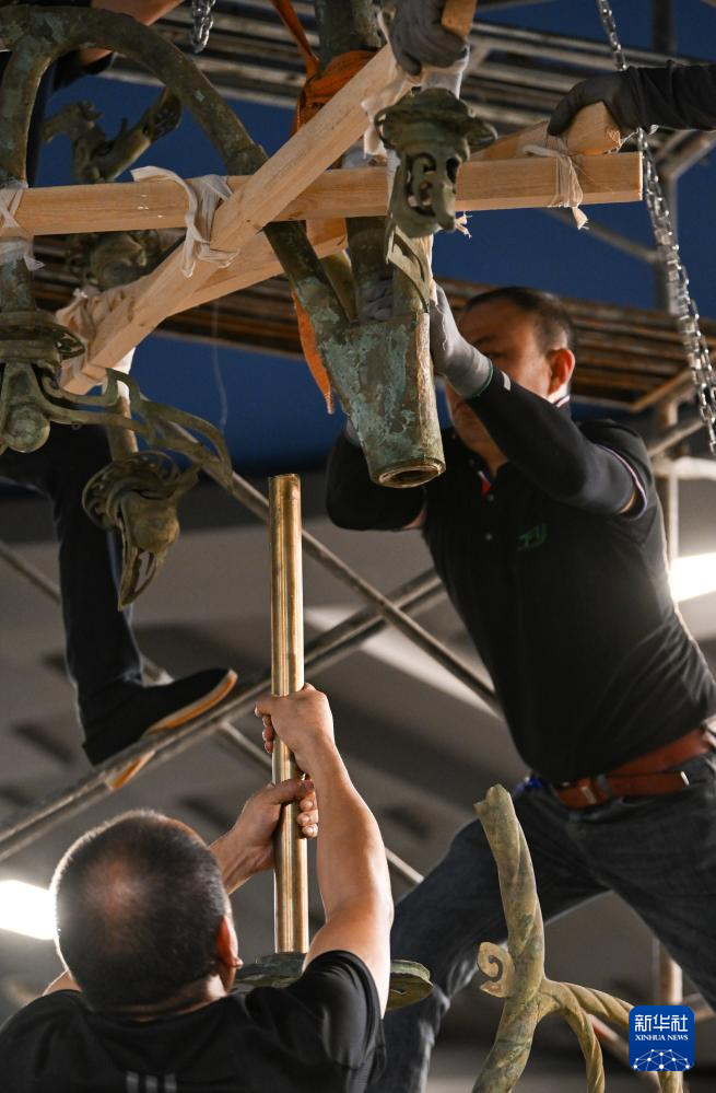 在三星堆博物馆老馆,工作人员在固定Ⅰ号大型铜神树的枝干(7月16日摄)。