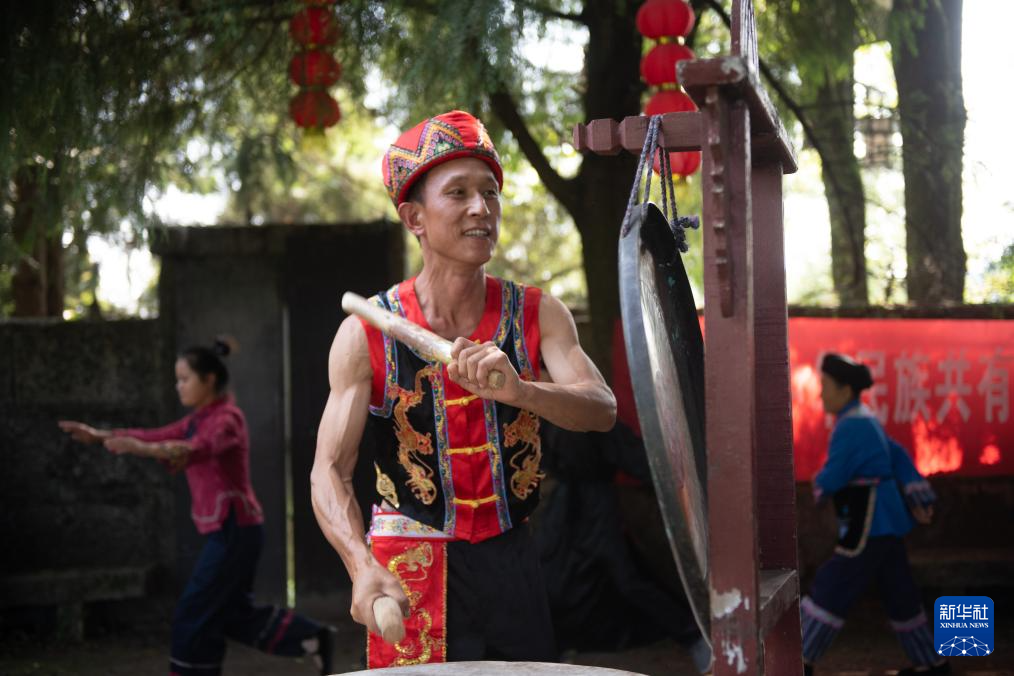 8月18日,舍米湖村村民彭成兵在摆手舞中击鼓敲锣。
