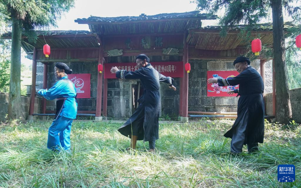 8月18日,舍米湖村村民在有着数百年历史的“摆手堂”前跳起摆手舞。