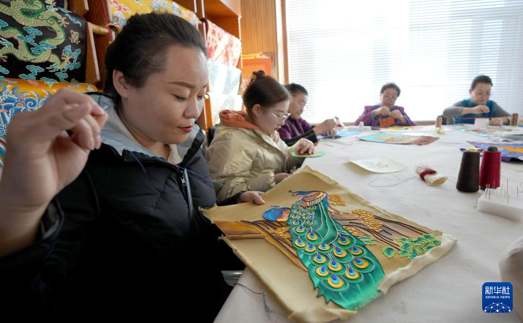 11月16日,在内蒙古阿拉善盟阿拉善左旗的马鬃绕线蒙古族唐卡传习所,陶格日勒(中)向农牧民传授制作技艺。