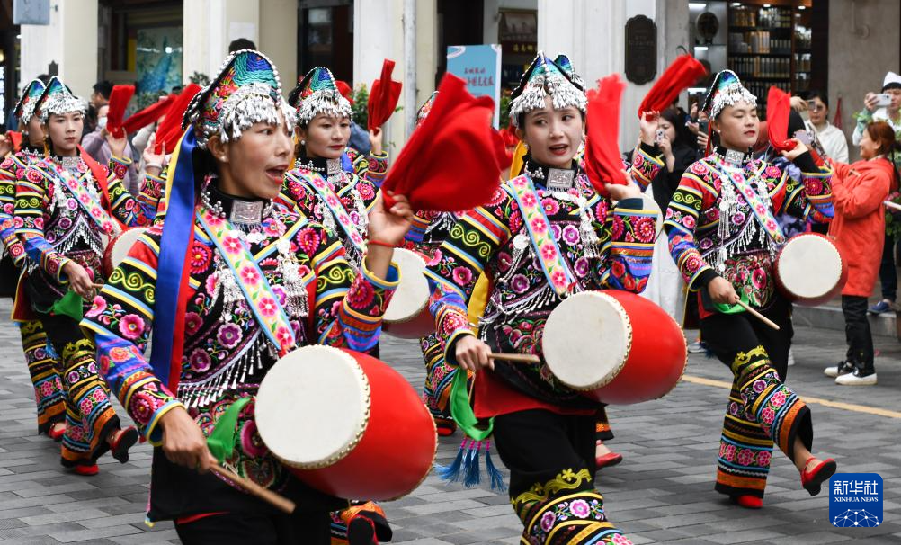 12月23日,来自云南楚雄州双柏县的“彝族花鼓舞”在海口骑楼老街进行非遗巡游。