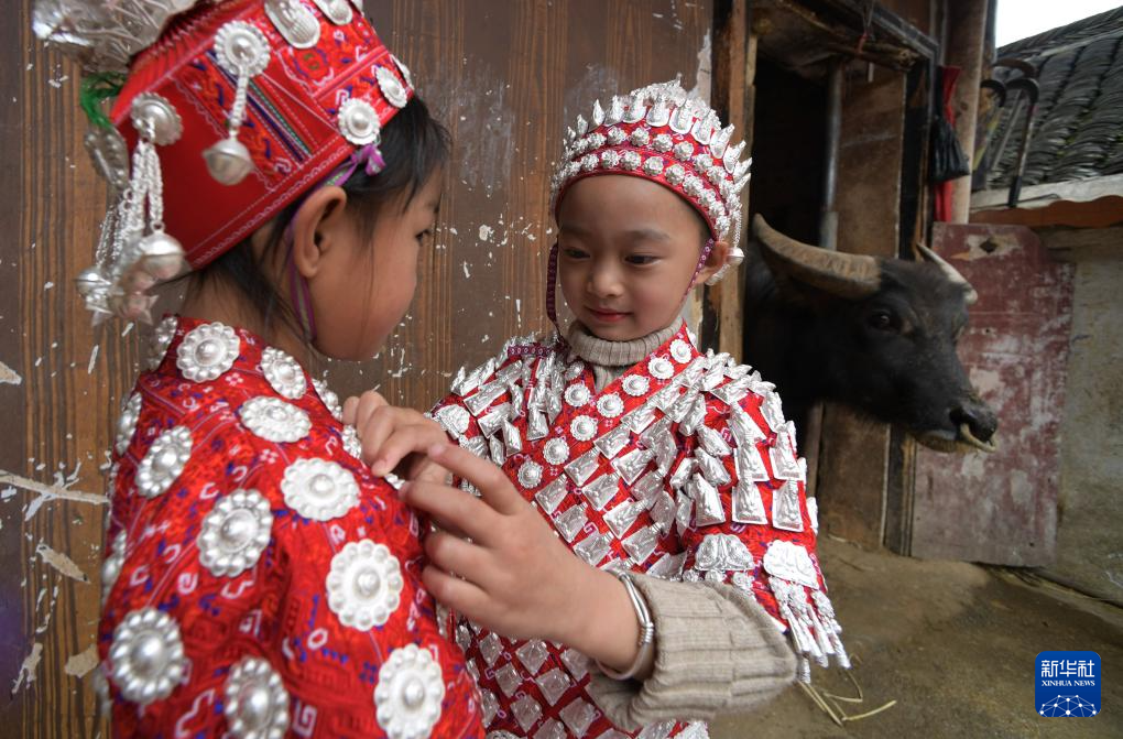 4月8日,穿着苗族盛装的小朋友在贵州省黄平县谷陇镇大寨村玩耍。