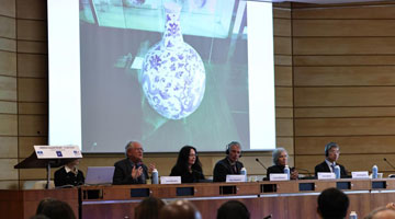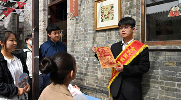 4月14日,在福州茉莉花文化体验馆,非遗技艺传承大师为福州外国语学校与姊妹校巴黎斯坦尼斯学校的师生讲解展示福州茉莉花茶窨制工艺。