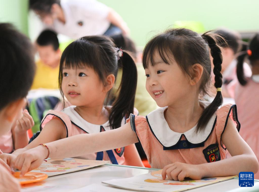 5月29日,在汕头市贵屿镇北林保婴幼儿园,庄恩琪(右)和同学在课堂上。