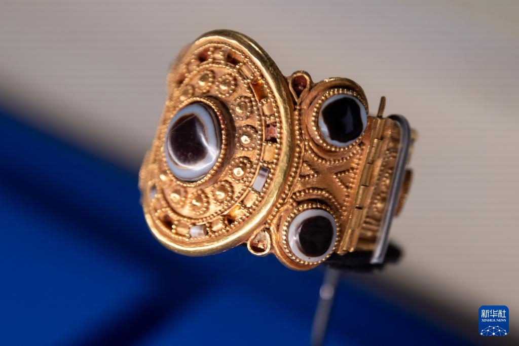 6月12日,在“古波斯的荣耀——伊朗文物精华展”上拍摄的“嵌玛瑙金手镯”。