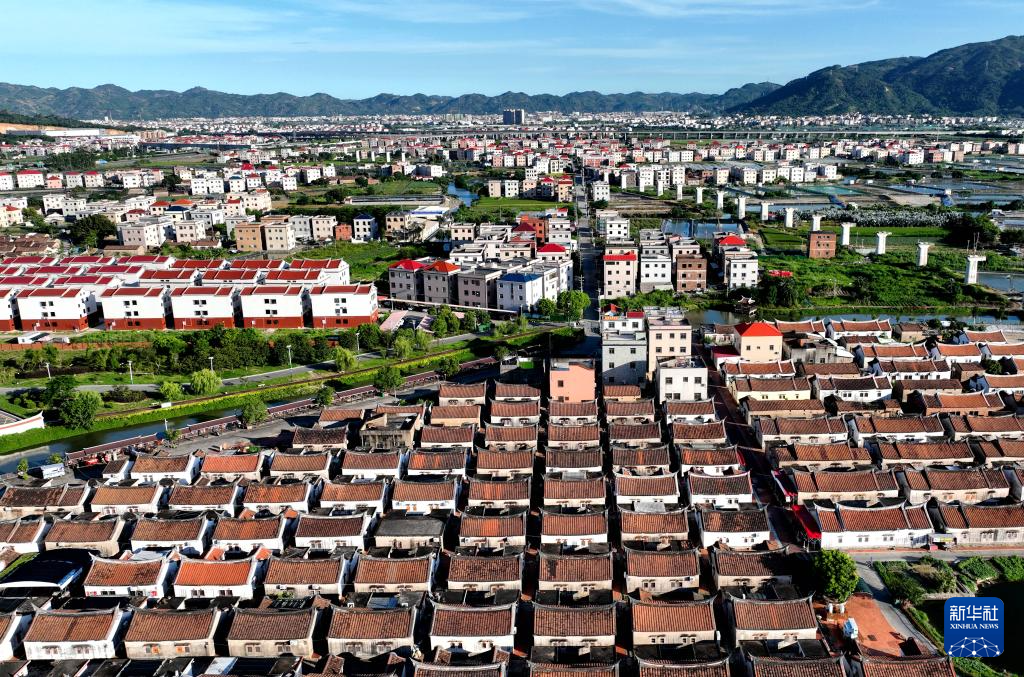 横竖对齐、整齐划一的埭美村古厝群(7月10日摄,无人机照片)。