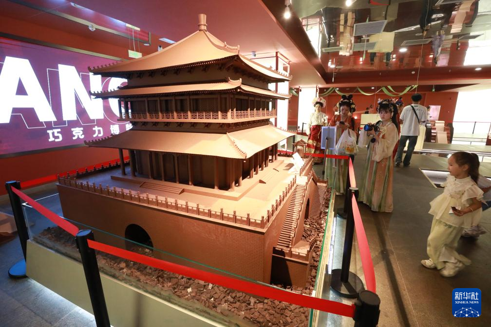 7月18日,游客在参观用巧克力制作的“西安钟楼”。