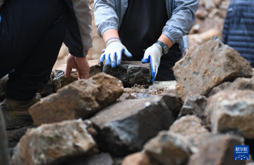 在箭扣长城120号敌台考古现场,工人们利用撬棍、滚木运输一块挖出的条石(7月2日摄)。