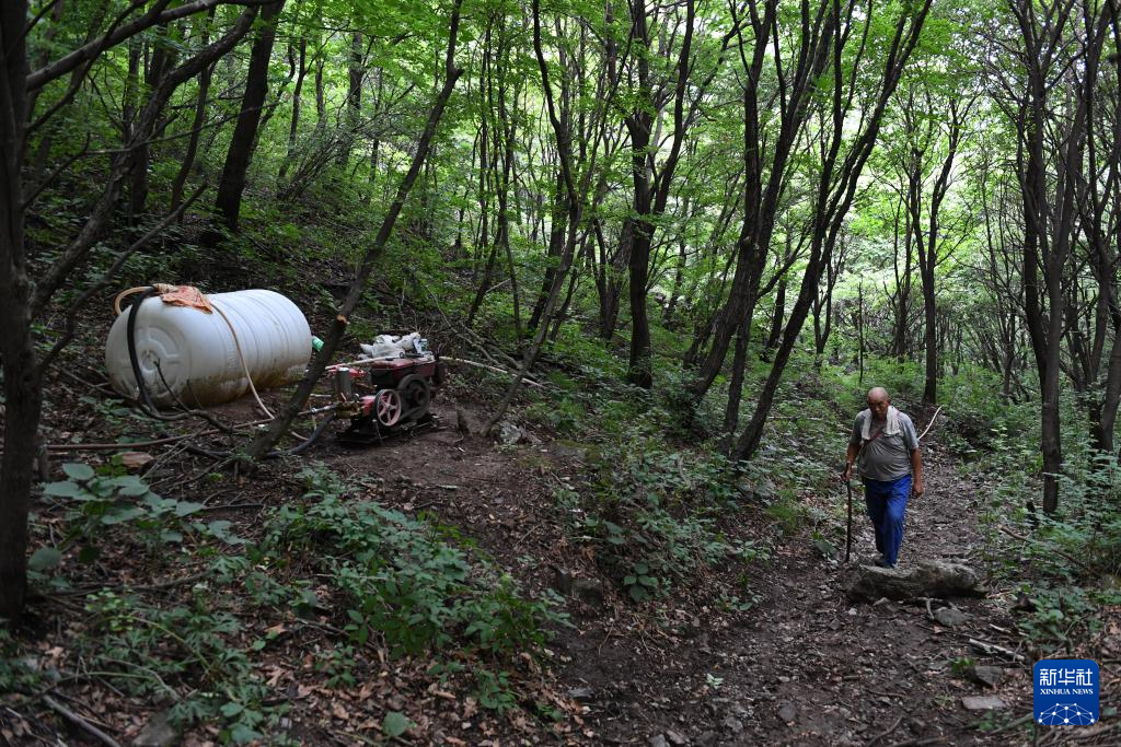 工人在前往箭扣长城考古工地途中经过一处水泵设施(7月2日摄)。水泵将山下的水运输至施工现场,用来制作灰浆等施工材料。