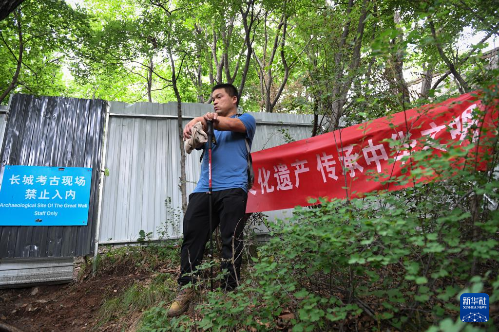 负责考古现场的技工杨战杰抵达箭扣长城考古现场,等待保安开门(7月2日摄)。