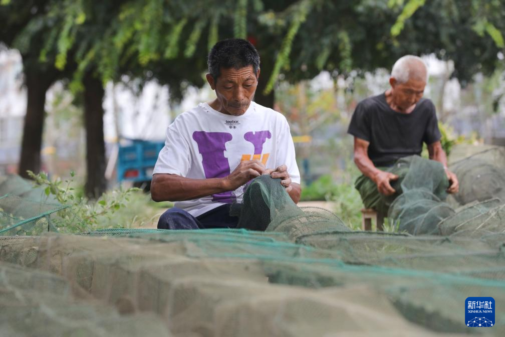 8月27日,江苏省淮安市洪泽区老子山镇龟山村村民在修补螃蟹网笼。