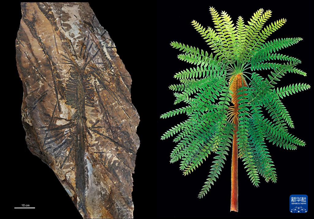 这是在内蒙古自治区乌达二叠纪植被化石产地发现的植物化石及植物复原图(资料图片)。新华社发