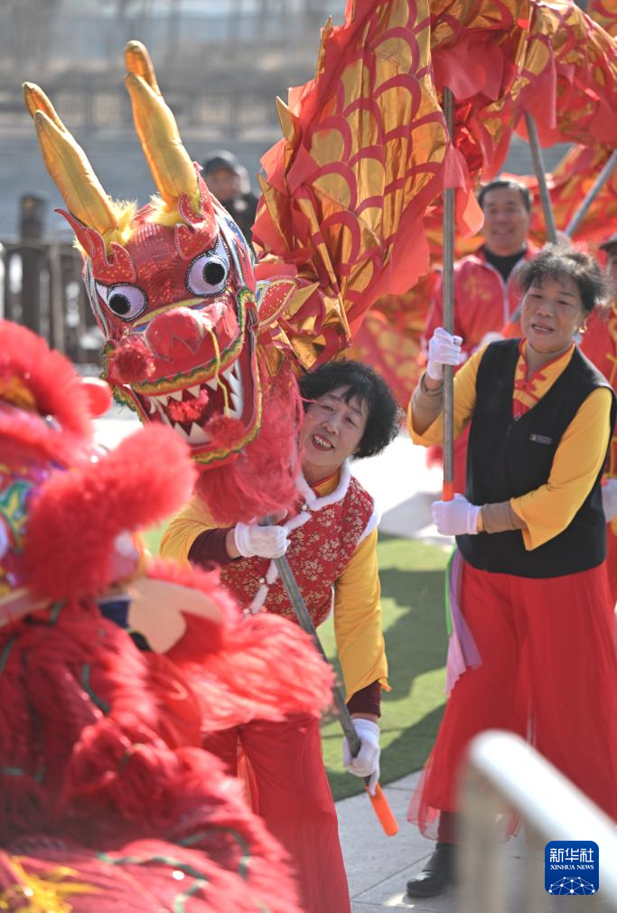 2月2日,演艺人员在杨柳青古镇舞龙。